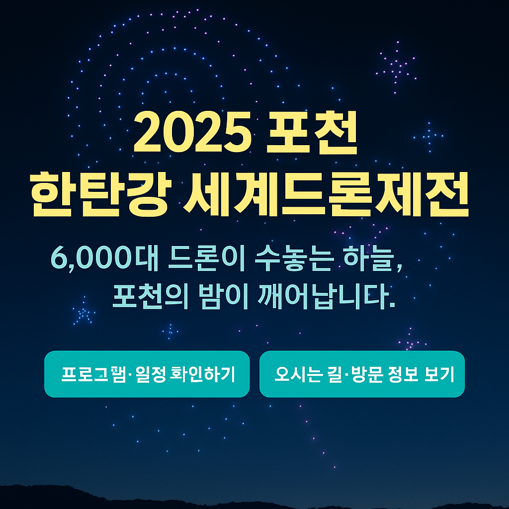 국내 최대 6,000대 드론 라이트쇼와 드론레이싱·드론축구·체험존·세계음식문화축제·K-Music 페스티벌·캠핑페스타까지 한자리에서 즐길 수 있는 포천 대표 축제입니다.