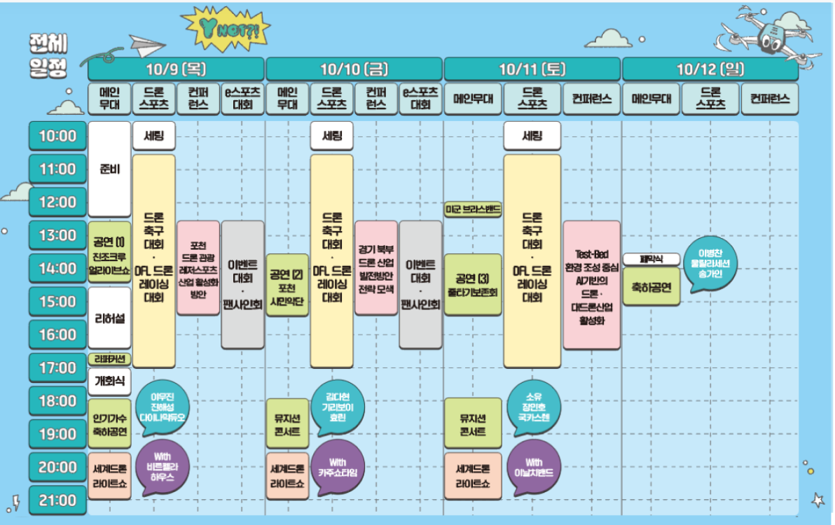 - 낮 시간 드론 체험존·드론축구·세계음식문화축제를 중심으로 관람하시면 좋습니다.