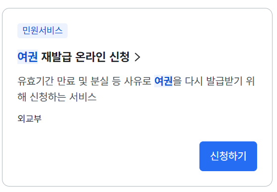 일부 조건을 만족하면 방문 없이 정부24에서 여권 온라인 재발급 신청이 가능합니다.