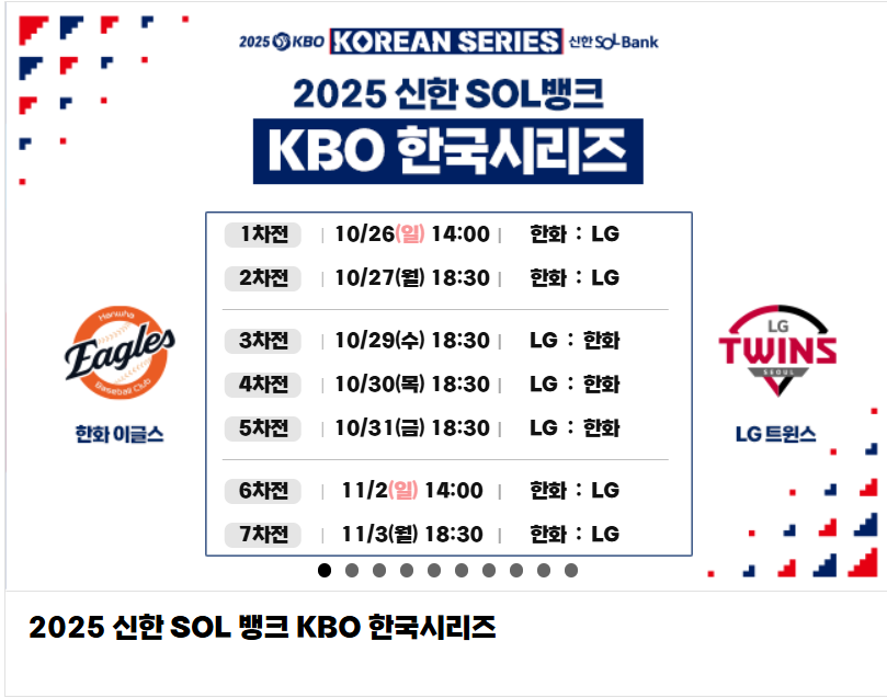 올해 한국시리즈는 LG 트윈스와 한화 이글스의 맞대결로 확정되었으며, 예매는 지정된 플랫폼에서 전량 온라인 방식으로 진행됩니다.