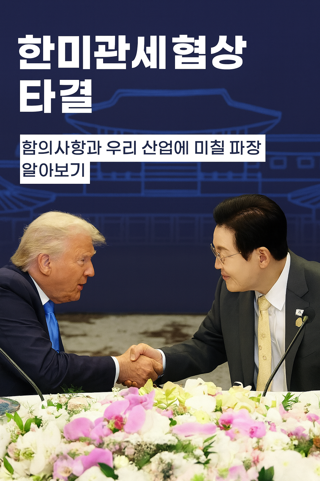 메타설명: 2025년 10월 29일 이재명 대통령과 도널드 트럼프 미국 대통령 간 정상회담을 통해 타결된 한·미 관세 및 투자 협상 내용을 정리합니다. 총 3,500억 달러 투자 중 2,000억 달러 현금 투자, 연간 상한 200억 달러, 조선업 협력 1,500억 달러, 자동차·반도체·농업 분야 관세 개편 등이 포함되어 있습니다.