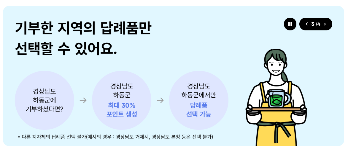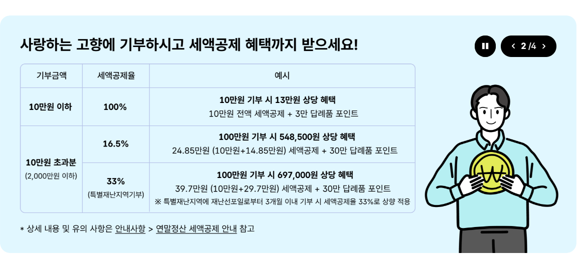 - 답례품 선택: 지자체별 제공 품목 중 선택 (기부금의 30% 한도)