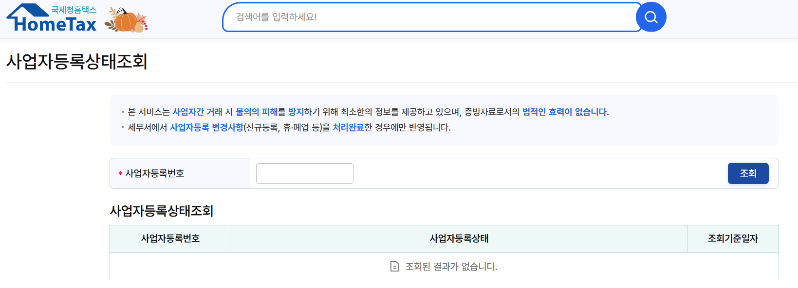 홈택스에서는 간단히 사업자등록번호만 입력하면 등록 상태를 바로 확인할 수 있습니다.